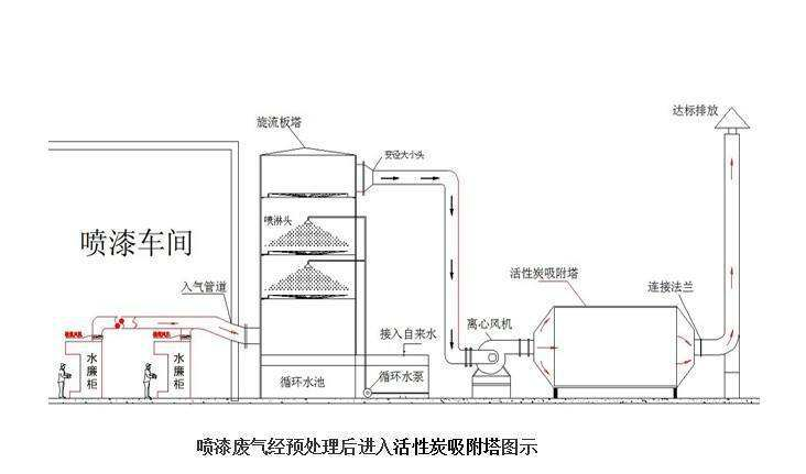 廢氣經(jīng)過吸附塔內(nèi)的初效過濾器除去固體顆粒物后,進入塔體,經(jīng)過活性炭層吸附后,除去氣體中的有機廢氣分子,達到符合排放標準的凈化氣體,經(jīng)風機排到室外。