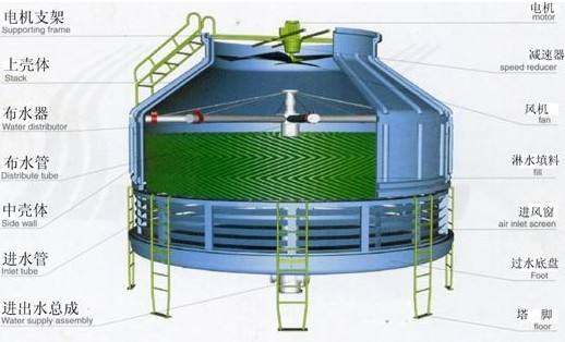冷卻塔主要靠機(jī)械通風(fēng)冷卻循環(huán)熱水。用泵將循環(huán)熱水送到水分布器噴出水沿著填料下淋落到水池。由風(fēng)機(jī)將冷空氣引入與下淋的熱水接觸進(jìn)行熱交換將水冷卻。