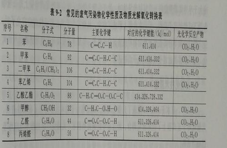 1、光解技術的原理光解是利用UV紫外光的能量使空氣中的分子變成游離氧,游離氧再與氧分子結合,生成氧化能力更強的臭氧。近而破壞VOCs中的有機或無機高分子化合物分子鏈,使之變成低分子化合物,如CO、HO等。由于UV紫外光的能量遠遠高于一般有機化合物的結合能,因此,采用紫外光照射有機物,可以將它們降解為小分子物質(zhì)。
