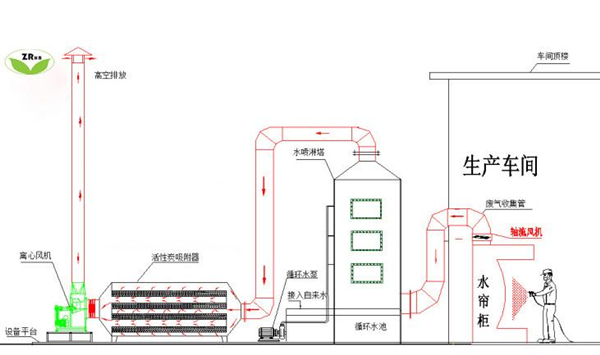 根據(jù)廢氣的特點(diǎn)及環(huán)保要求,擬采用活性炭吸附工藝(活性炭吸附塔)+旋流板廢氣凈化塔進(jìn)行綜合廢氣處理。